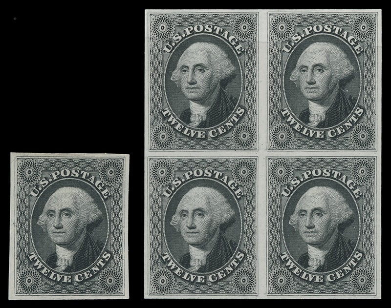 1857-60 (1875 Reprint), 12¢ greenish black, plate proof on India paper, single and block of four, large margins, right pair of block each with typical tiny India thin, fresh and Very Fine.