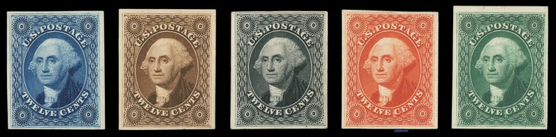 1857-60 (1875 Reprint), 12¢ "Atlanta" trial color plate proofs on card complete, set in blue, green, brown, black and deep orange on thin card, mostly large to huge margins, Very Fine set.
