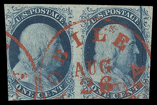 1851, 1¢ blue, type II, major cracked plate, horizontal pair, positions 1-2L2, right stamp with massive plate crack at right, large margins to in, intense color and impression, canceled by paint red "Mobile Ala. Aug 26" cds , some light paper wrinkling, a Very Fine and striking example of this plate crack.