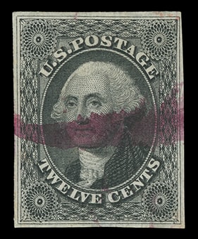 1851, 12¢ gray black, position 69R1, four balanced margins, magenta brush stroke and light red cancels, Very Fine and attractive; with 2006 P.S.E. certificate.