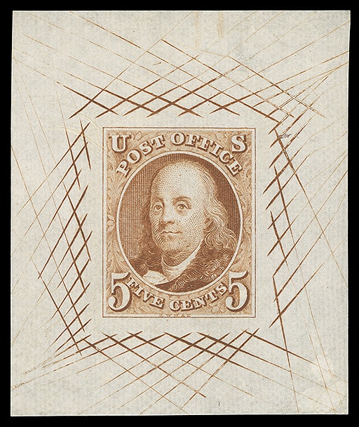 1847, 5¢ red brown, large die proof on white bond paper, 41 x 49mm, with cross-hatching, bright color, fresh and Very Fine.