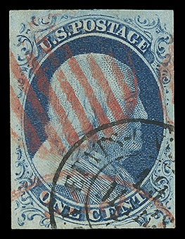 1852, 1¢ blue, type IV, position 83R1L, mostly large margins except barely touching top right ornament, rich color and sharp impression, attractive New York red grid and partial exchange cds plus additional French "Etats-Unis" transit cds, Very Fine and choice.