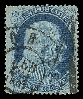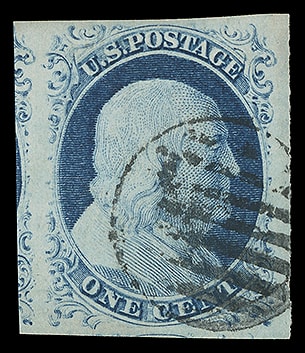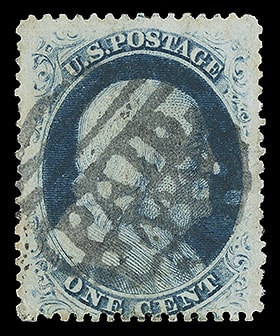1857, 1¢ blue, type V, bold strike of Elaborate "Paid" Grid (Skinner-Eno PM-PE 5) of Dedham, Mass., trivial lower left corner crease, an Very Fine and remarkable strike of this scarce paid cancel.