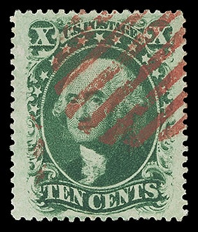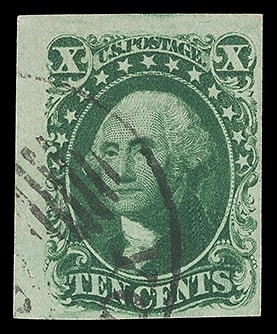 1859, 10¢ green, type V, exceptionally well centered with wide margins, deep color and strong impression, attractive bold NYFM red open circular grid cancel, an Extremely Fine gem.