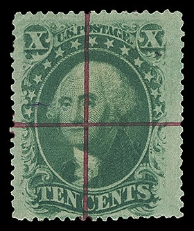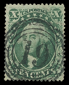 1859, 10¢ green, type V, o.g., neat paper hinge remnant, well centered, magenta presentation cancel , faint corner crease, Very Fine and striking scarce.