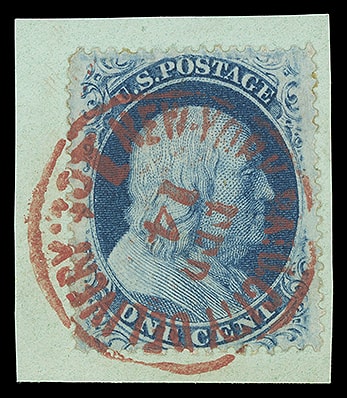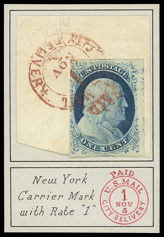 1857, 1¢ blue, type V, position 95R10, pretty shade, tied by bold red "New York City Delivery 'Paid 1ct' Feb 14" carrier cds on small greenish blue piece, an Extremely Fine gem, ex-Grunin .