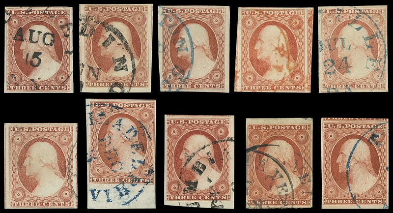 Scott No. 11, 11A ◦ ◦ ◦ ◦ ◦ $2,085+.Lot 1276