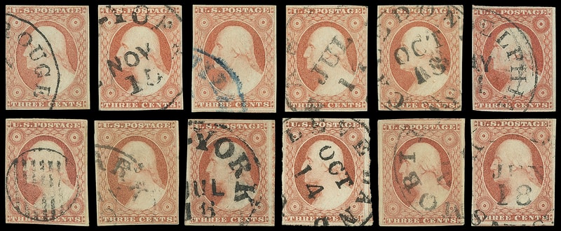 1852, 3¢ Dull Red, Rose Red, Orange Red, Shade Study, group of 139 stamps neatly arranged on two-line stock cards, many plated, beautiful range of shades from the Dull, Rose and Orange Red family, most with at least intact framelines and many with full to large margins, all with handstamp cancels, a few flaws to be found but most are fresh and sound, Very Fine group, a wonderful study.