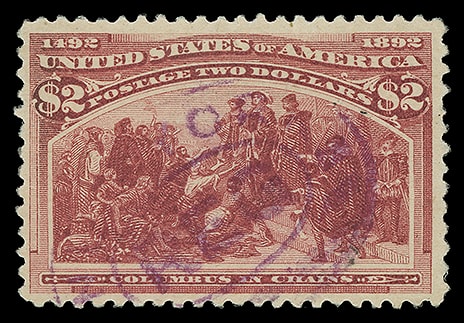 1893, $2 Columbian, nicely centered, canceled by pretty purple "New York, Reg" registry double-oval, natural paper wrinkle, fresh and Very Fine to Extremely Fine; with 2025 P.F. certificate graded ( VF-XF 85, SSV $675 ).