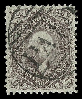 1862, 24¢ red lilac, exceptionally well centered, rich color on bright paper, neat large Boston "Paid" circular grid cancel, Extremely Fine and choice; with 2001 and 2021 P.F. certificates, latter graded (XF 90, SMQ $1,100) .