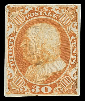 1860, 30¢ orange, plate proof on India paper, four margins, minor ms. offset shows through, otherwise Very Fine; with clear 1997 P.F. certificate.
