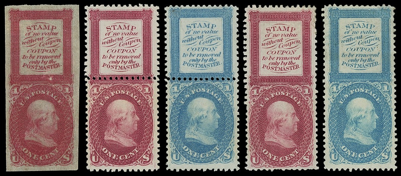 1865, 1¢ Franklin, Bowlsby coupon essays, plate on white paper, five, E13d completely imperforate (creased), E13f perforated all around in red and blue, and E13g perforated around, imperf between stamp and coupon in red and blue (creased between coupon), nice margins, all gummed except last without, Very Fine group.