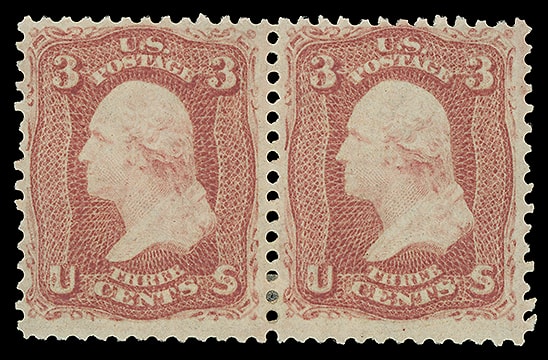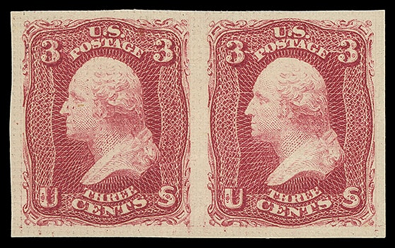 1867, N.B.N.C. grill essay, allover grill of small squares, points up, on 3¢ lake, imperf pair, gummed (formerly No. 66aP4), horizontal pair, large margins, deep rich color, two mild diagonal creases, o.g., lightly hinged, fresh and Extremely Fine appearance; with 2024 P.S.E. certificate.