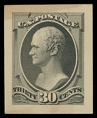 1873, 30¢ gray black, C.B.N.C. printing, "Panama-Pacific" small die proof, Bright color, some slight toning at top and bottom as usual, Very Fine, only 3-5 were produced, ex-Lake Shore ; with 1977 P.F. certificate.