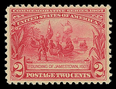 1907, 2¢ Jamestown, o.g., never hinged, remarkably well centered, vibrant color, Extremely Fine; with 2014 P.S.E. certificate graded ( XF 90 ).