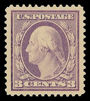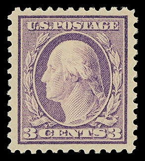 1911, 3¢ deep violet, S.L. watermark, o.g., never hinged, exceptionally well centered within wide balanced margins, bright shade, an Extremely Fine to Superb jumbo; with 2019 P.S.E. certificate graded ( XF-SUP 95J ).