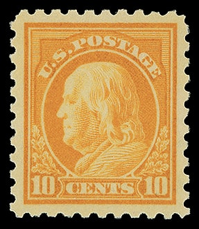 1914, 10¢ orange yellow, S.L. watermark, perf. 10, o.g., never hinged, precisely centered within beautifully balanced margins, vibrant color, fresh and Extremely Fine to Superb; with 2010 P.S.E. certificate graded ( XF-SUP 95 ).