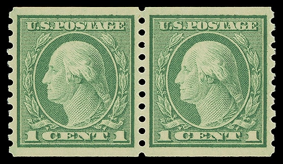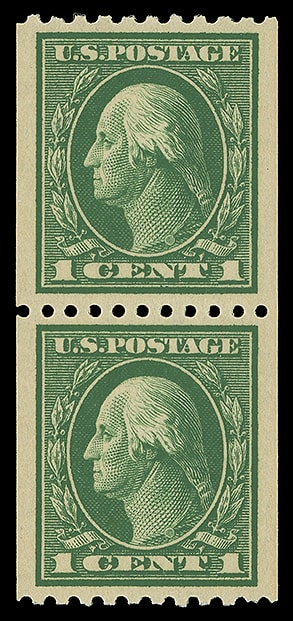 1914, 1¢ green, S.L. watermark, horizontal rotary press coil, pair, o.g., never hinged, extraordinarily well centered, bright and fresh, Extremely Fine to Superb; with 2006 P.S.E. certificate graded ( XF-SUP 95 ).