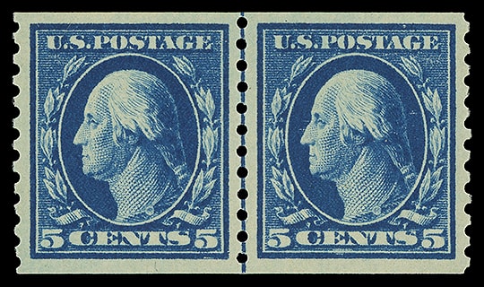 1914, 5¢ blue, S.L. watermark, horizontal flat plate coil, line pair, o.g., never hinged, exceedingly well centered, intense shade and impression, fresh and Extremely Fine; with 1980 & 1998 P.F., 2021 P.S.E. certificates, latter graded ( XF 90 ).