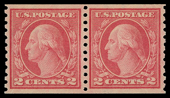 1915, 2¢ red, type II, S.L. watermark, horizontal rotary press coil, pair, o.g., never hinged, beautifully centered, brilliant color, Very Fine to Extremely Fine; with 1994 and 2019 P.F. certificates, latter graded ( VF-XF 85 ).