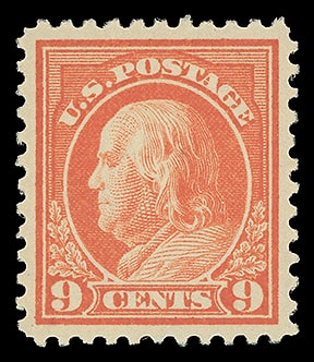 1917, 9¢ salmon red, perf. 11, o.g., never hinged, exceedingly well centered, vibrant color on bright paper, fresh and Extremely Fine to Superb; with 2006 P.S.E. certificate graded ( XF-SUP 95 ).