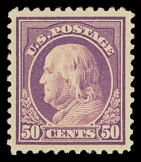 1917, 50¢ red violet, perf. 11, o.g., never hinged, outstanding centering, pretty pastel color, Extremely Fine to Superb gem; with 2005 P.S.E. certificate graded ( XF-SUP 95 ).