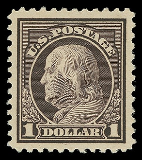 1917, $1 violet brown, perf. 11, o.g., never hinged, exceedingly well centered with extra large margins, rich color on bright paper, an Extremely Fine to Superb jumbo; with 2011 P.S.E. certificate graded ( XF-SUP 95J ).