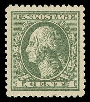 1919, 1¢ gray green, offset printing, perf. 12½ o.g., never hinged, beautifully centered within large margins, fresh color, Extremely Fine to Superb; with 2004 P.S.E. certificate graded ( XF-SUP 95 ).
