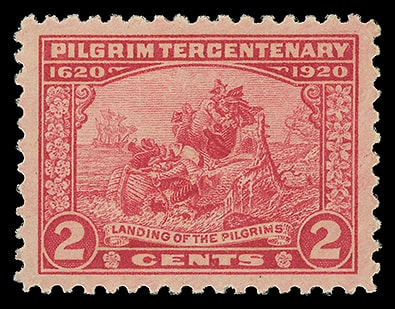 1920, 2¢ Pilgrim, o.g., never hinged, extraordinarily well centered within large margins, Extremely Fine to Superb jumbo; with 2004 and 2005 P.S.E. certificates, latter graded ( XF-SUP 95J ).