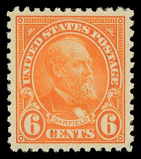 1922, 6¢ Garfield, o.g., never hinged, extraordinarilly well centered within balanced margins, brilliant glowing color on brilliant paper, a Superb gem; with 2020 P.S.A.G. certificate graded ( SUP 98 ).