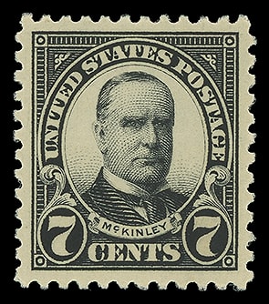 1923, 7¢ McKinley, o.g., never hinged, exceptionally well centered within large margins, prooflike color and impression, Extremely Fine to Superb jumbo; with 2003 P.S.E. certificate graded ( XF-SUP 95J ). Scott $16.