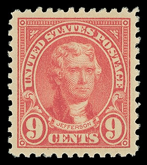 1923, 9¢ Jefferson, o.g., never hinged, precise centering with beautifully balanced margins, vivid color on bright paper, fresh and Extremely Fine to Superb; with 2010 P.F. certificate graded ( XF-SUP 95 ).