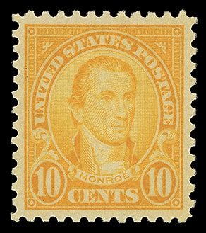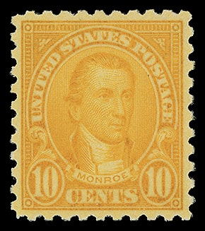 1923, 10¢ Monroe, o.g., never hinged, exceptionally well centered within precise margins, radiant color on brilliant paper, Extremely Fine to Superb; with 2020 P.S.E. certificate graded ( XF-SUP 95 ).
