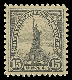 1922, 15¢ Statue of Liberty, o.g., never hinged, wide and balanced margins, intense shade, Extremely Fine to Superb; with 2020 P.S.E. certificate graded ( XF-SUP 95 ). Scott $35.