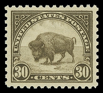 1923, 30¢ American Buffalo, o.g., never hinged, perfectly centered within beautifully balanced large margins, strong color and impression on bright paper, a Superb gem; with 2019 P.S.A.G. certificate graded ( SUP 98J ).