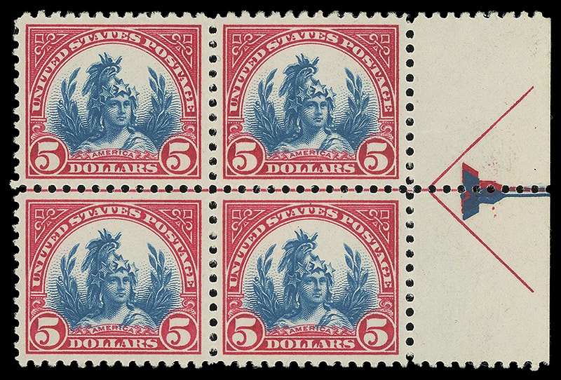 1923, $5 America, right guideline arrow block of 4, o.g., never hinged, choice centering, brilliant colors, typical natural gum creases, Very Fine and attractive.