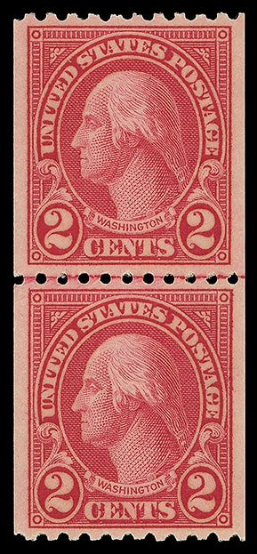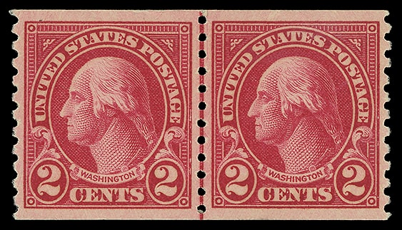 1923, 2¢ Washington, vertical rotary press coil, line pair, o.g., never hinged, exceedingly well centered, brilliant color, particularly fresh and Extremely Fine to Superb line pair; with 2015 P.S.E. certificate graded ( XF-SUP 95, SMQ $200 ).