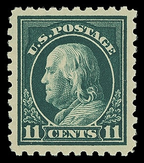 1915, 11¢ dark green, S.L. watermark, perf. 10, o.g., never hinged, gorgeous centering, deep rich color contrasts nicely with bright paper, long and full perforations, an Extremely Fine to Superb gem; with 2021 P.F. certificate graded ( XF-SUP 95 ).