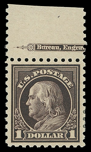 1916, $1 violet black, unwatermarked, perf. 10, o.g., small hinge remnant, top imprint selvage single, exceedingly well centered, rich color with a strong impression, Extremely Fine.