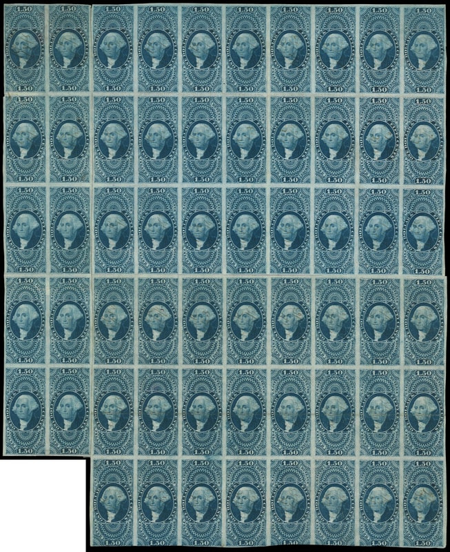 Revenue, 1862, First Issue, $1.50 Inland Exchange, imperf., block of 58 comprising two blocks of 24 and a block of ten, large margins to just in at bottom of bottom block of 24, faint manuscript cancels indicate all were likely used on the same document or on the same day, few flaws including creases and small tears, otherwise Fine-Very Fine, this is the largest recorded multiple, the next largest is a block of ten, the block of ten and one block of 24 ex Cunliffe, the other block of 24 ex Weill sale, reunited by Curtis, ex-Curtis .