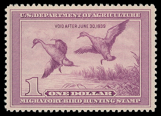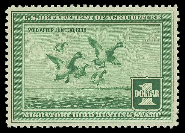 Federal Duck Stamp, 1937, $1 Scaup Ducks, o.g., never hinged, well centered, strong color and bright paper, fresh and Extremely Fine; with 2004 and 2021 P.S.E. certificates, former graded ( XF-SUP 95 ).