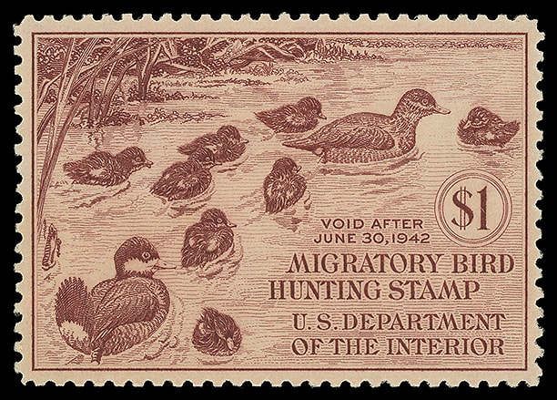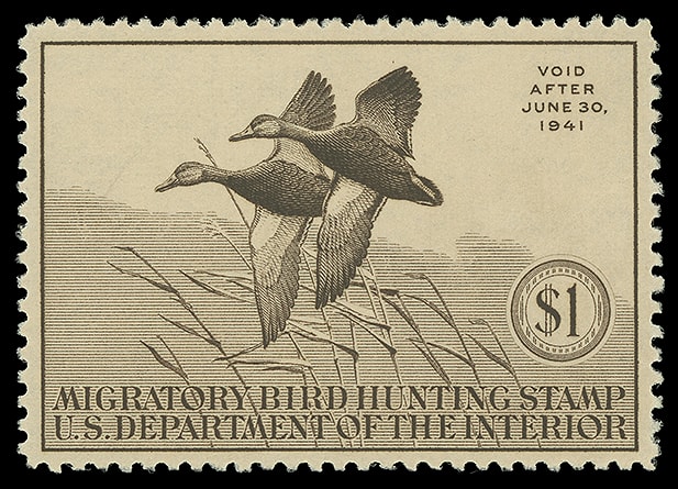 Federal Duck Stamp, 1941, $1 Ruddy Ducks, o.g., never hinged, exceptionally well centered within balanced margins, strong color, an Extremely Fine to Superb gem; with 2019 P.F. certificate graded ( XF-SUP 95 ). Scott $225.