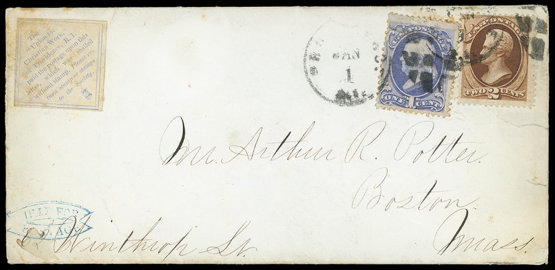 Providence R.I. "Union for Christian Work", blue on white Good Samaritan label reading "The "Union for Christian Work" of Providence, R.I. paid the postage upon this letter, which was mailed without stamp. Please return stamp or stamps to the Society ." on cover bearing 1¢ ultramarine (145) , torn, and 2¢ red brown (146) tied by two partial strikes of "Providence R.I. Jan 1" duplex to Boston Mass., blue "Held for Postage" framed handstamp at lower left; light perf and label toning, reduced slightly at right with two edge tears, Fine and rare.