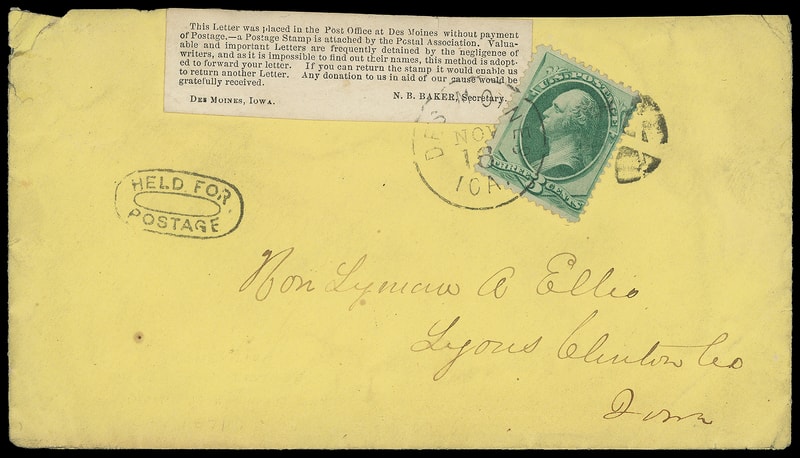 Des Moines Ia., Postal Association, black on white Good Samaritan label affixed on yellow cover with "Held for Postage" double-oval and bearing 3¢ green (147) tied by "Des Moines Ioa. Nov 16" duplex to Lyons, Iowa; upper left corner tear and edge wear, no flap, still Very Fine and rare label, the only recorded example .