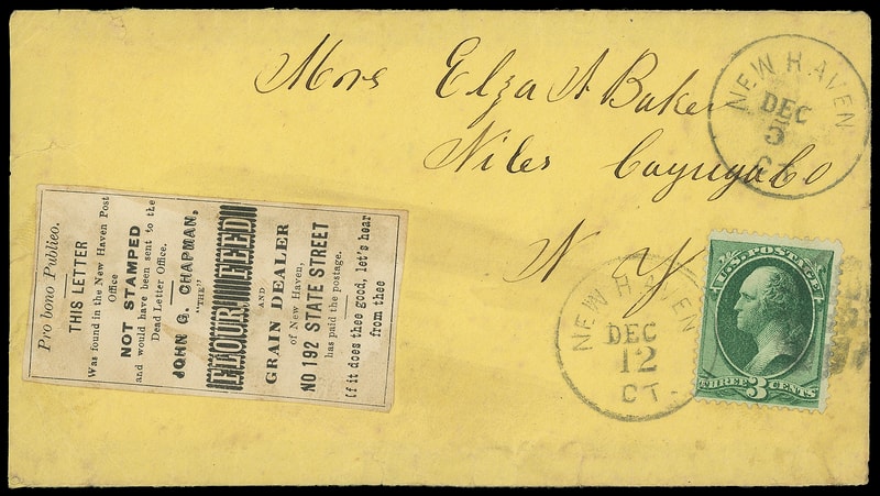 New Haven Ct., John G. Chapman, Flour Feed and Grain Dealer, illustrated advertising Good Samaritan label affixed on yellow cover held for postage with "New Haven Ct. Dec 5" cds and bearing 3¢ green (158) tied by "New Haven Ct. Dec 12" duplex to Niles N.Y.; small flaws and wear, still Very Fine, Only 4 recorded examples of this New Haven Ct. Good Samaritan label .