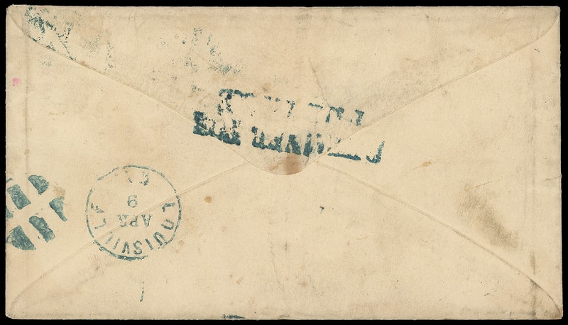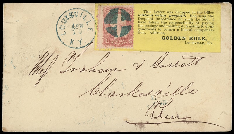 Louisville Ky. "Golden Rule", black on yellow Good Samaritan label reading " This letter was dropped in the Office without being properly prepaid. Realizing the frequent importance of such letter. I have take the responsibility of paying the postage and mailing it, trusting to your generosity to return a liberal compensation. Address, Golden Rule, Louisville, Ky. " with stamp holder bearing 3¢ rose (65) canceled by bold blue quartered cork duplexed with Louisville Ky. Apr 10" cds on light buff cover to Clarksville Tenn., reverse blue "Louisville Ky. Apr 9" duplex and partial "Detained For Postage" two-line handstamp, Very Fine and choice.