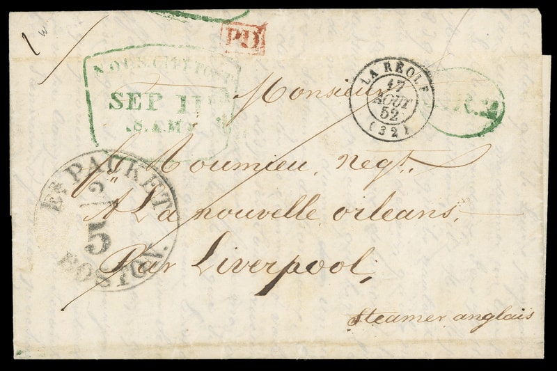 1852 (Aug. 17) La Reolf, France to New Orleans La., folded letter with "La Reolf, 17 Aout 52" cds and small red "PD" framed handstamp with ms. "13" decimes rating on flap, carried by Cunard Line America from Liverpool Aug. 21st to Boston arriving Sep. 2nd, "Br. Packet, Boston '5' 2 Sep" debit exchange cds, green "N.O.U.S. City Post, Sep 11, 8 P.M. " snow shovel carrier handstamp and matching " Car. 2 " oval, fresh and Very Fine incoming New Orleans carrier use.