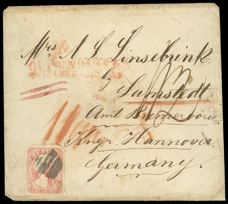 1853 (Mar.) New York N.Y. to Samstedt, Hannover, Germany, folded cover bearing Swarts' City Dispatch Post, New York N.Y. (1c) Pink on Wove (136L10) , irregular margins, mostly large but touching at corner, grid cancel, tied by German red crayon rate marking, reverse with green "Liverpool, Ship, Ap 7 1853" framed backstamp and red London (4.8) transits with ms. "1/2" 1s2d debit rating, German red "9 4/12 England/über Bremen" two-line exchange handstamp along with red crayon markings, Fine and scarce transatlantic use, ex-Golden .