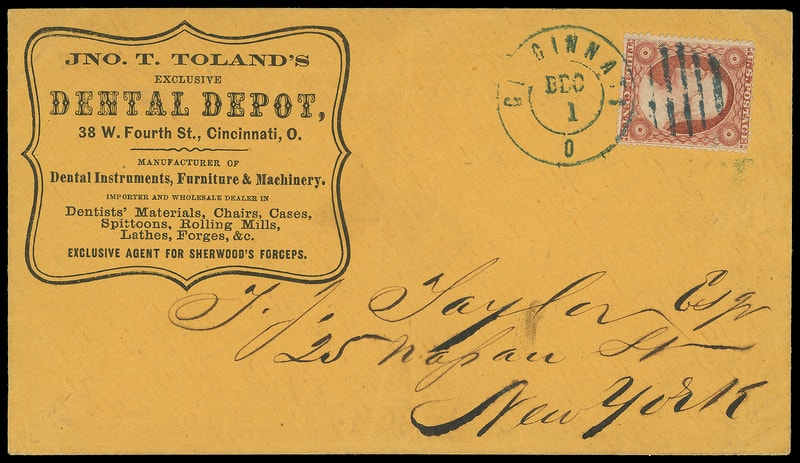 (Dental) Jno. T. Toland's Dental Depot, Cincinnati Oh., fancy shield corner card on orange cover bearing 3¢ dull red (26) tied by blue circular grid duplex with "Cincinnati O. Dec 1" cds to New York City, Very Fine and attractive.