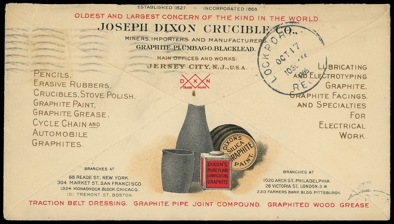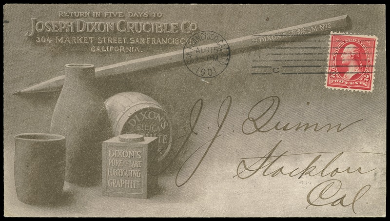 (Manufacturing) Joseph Dixon Crucible Co., San Francisco Cal., overall illustrated ad on both sides showing Pencil, Crucibles and Graphite Products bearing 2¢ red (279B) tied by "San Francisco, Cal. Aug 15, 1901" machine cancel to Stockton Cal.; reduced slightly at right, Very Fine and striking.